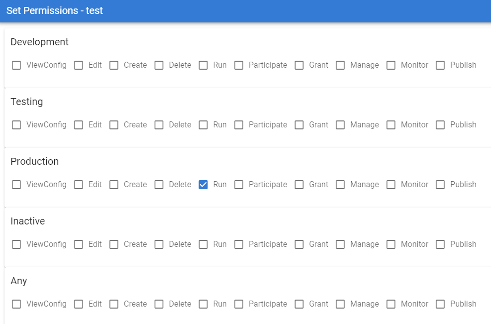 These permissions determine what a user can do to a process. Also, you will notice that the permissions also correspond to the Publish Status (Development, Testing, Production, Inactive, Any) of a process.