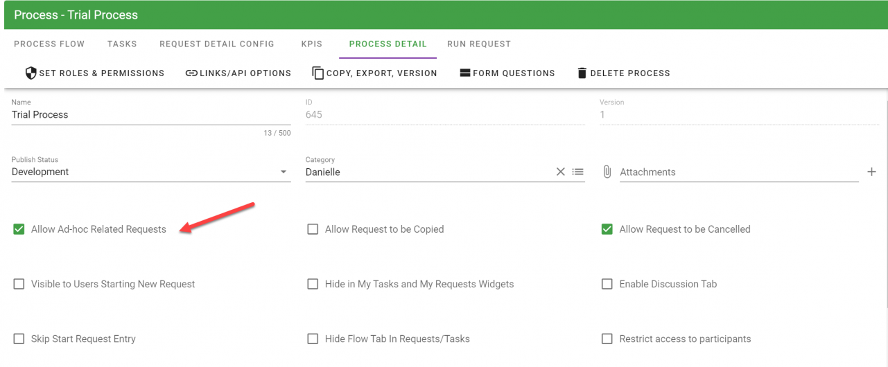 By selecting the ‘Allow Ad-hoc Related Requests’ in the Process Details settings, users will have the ability to relate a request for another process to a request for this process.