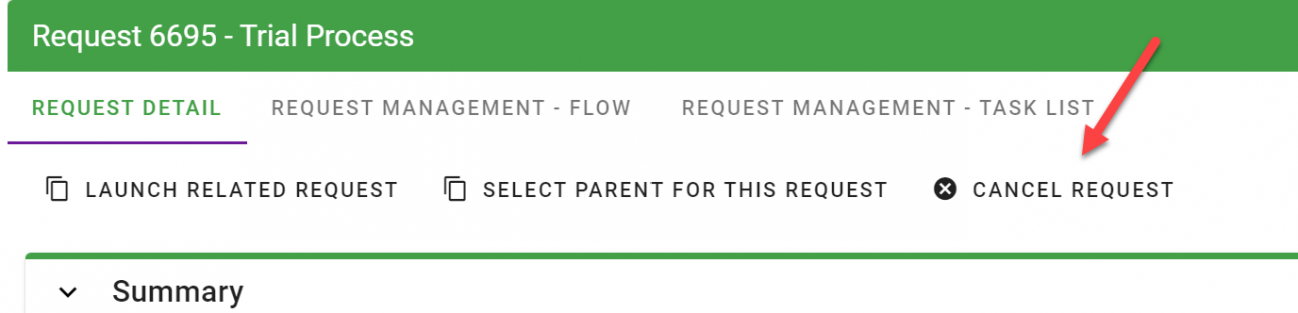 To enable the Cancel Request option, go to Processes under Administration, and open the process that needs this feature. Click the Process Detail section and find the Allow Request to be Cancelled button and toggle it on.