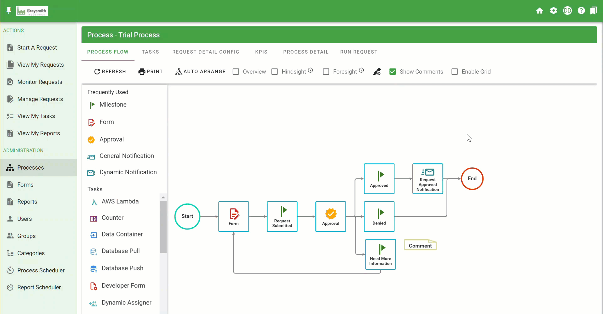 | Visible to users Starting New Request | Yes | This can hide the request from an end-user from initiating this process manually. This setting is most typically used when a process always needs to be started programmatically via Integrify’s Services API. This could also be used for a child process that you don’t want to be displayed when users start requests. |