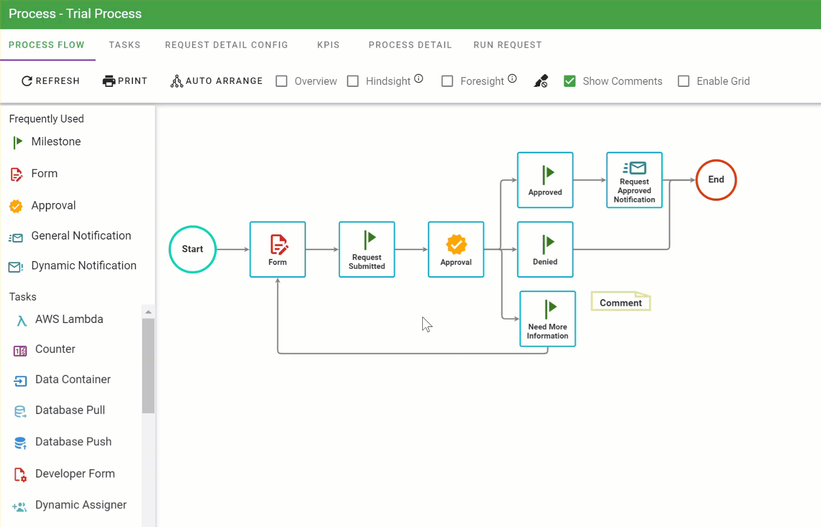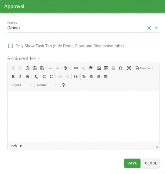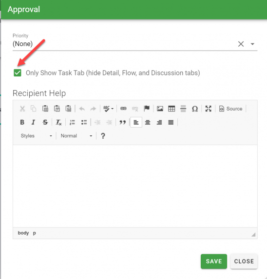 By default, this will not be selected so every task will include tabs for the request’s Detail, the Flow View, and Comments tabs**** that the task recipient can access.