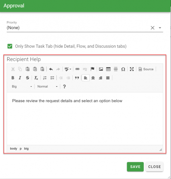 Warning: The combination of raw text and HTML/formatting mark-up is limited to 800 total characters. To assess the same, you may view the help text ‘source’ (by using ’< >’ control in the menu). Attempts to save help text in excess of this limit will not replace existing help text and, as of this writing (2/6/2020), you will not be warned that your changes have not been saved. Integrify DB reference: PROCESS_TASK.HELP_NOTES (nvarchar(800),null)