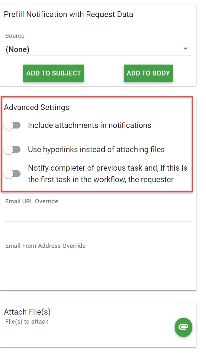 - Advanced Settings: allows you to include file attachments in your email notification from attached files in form tasks. Also, you can define the Email ‘from’ address and how recipients are notified.