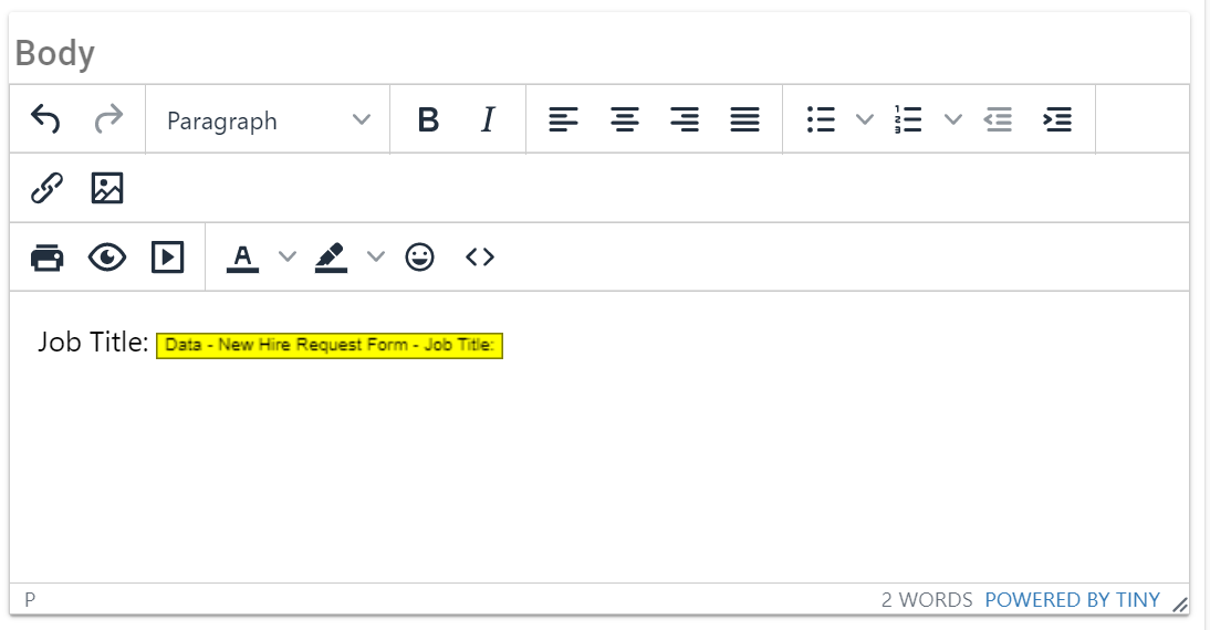 Once you have filled out the Prefill Notification with Request Data, choose Add to Body. The field will be added to the bottom of the Body section of the window. When the email is sent, Integrify will automatically retrieve the value for the Job Title question from the New Hire Request Form and insert it into the email: