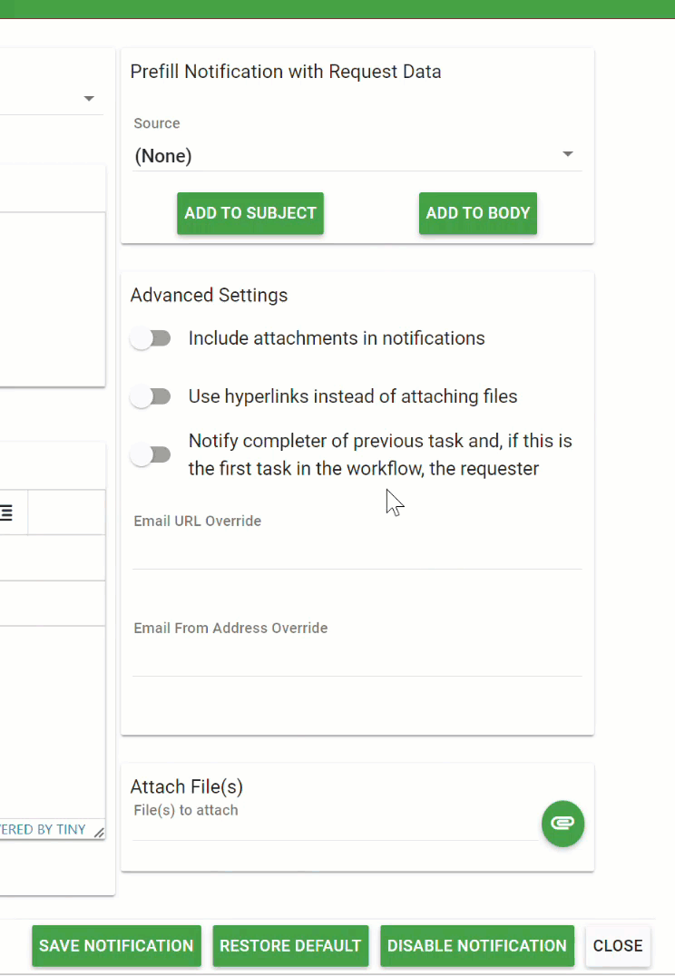 - Prefill Notification with Request Data: provides the ability to select specific data from within the request to be included in your email