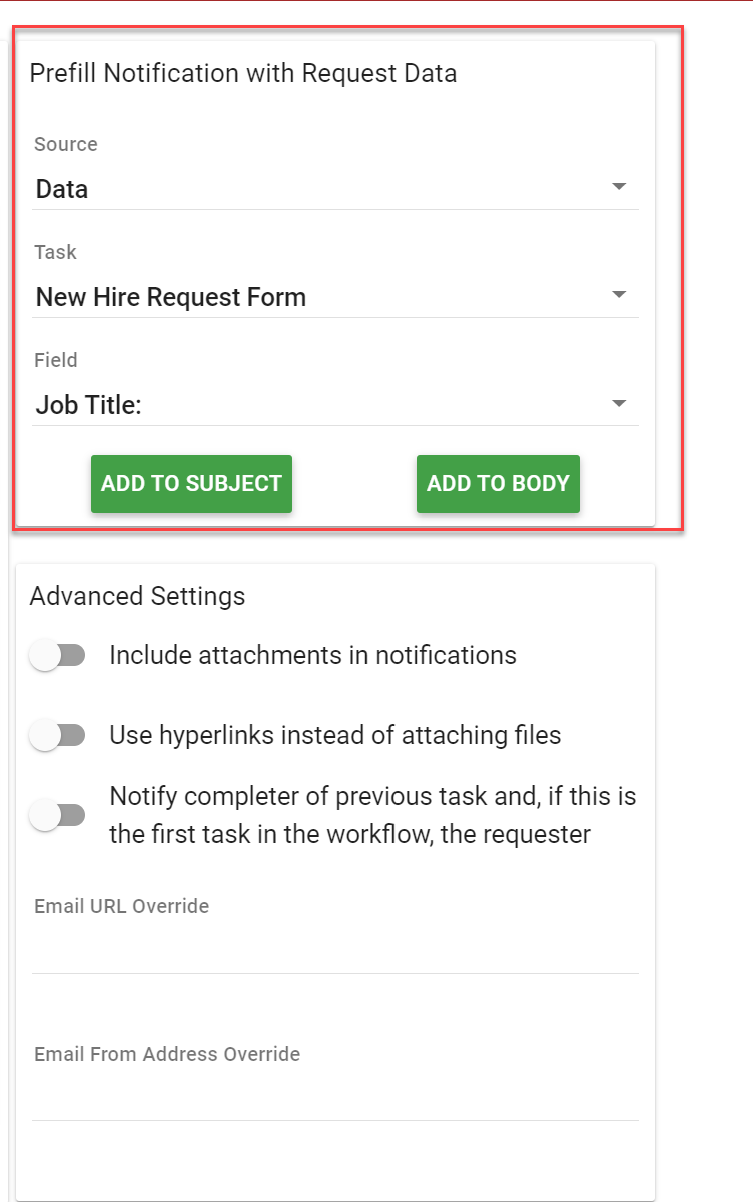 The Prefill Notification with Request Data area enables you to select data from a Form task, a Requester’s name, name of the Request, etc.
