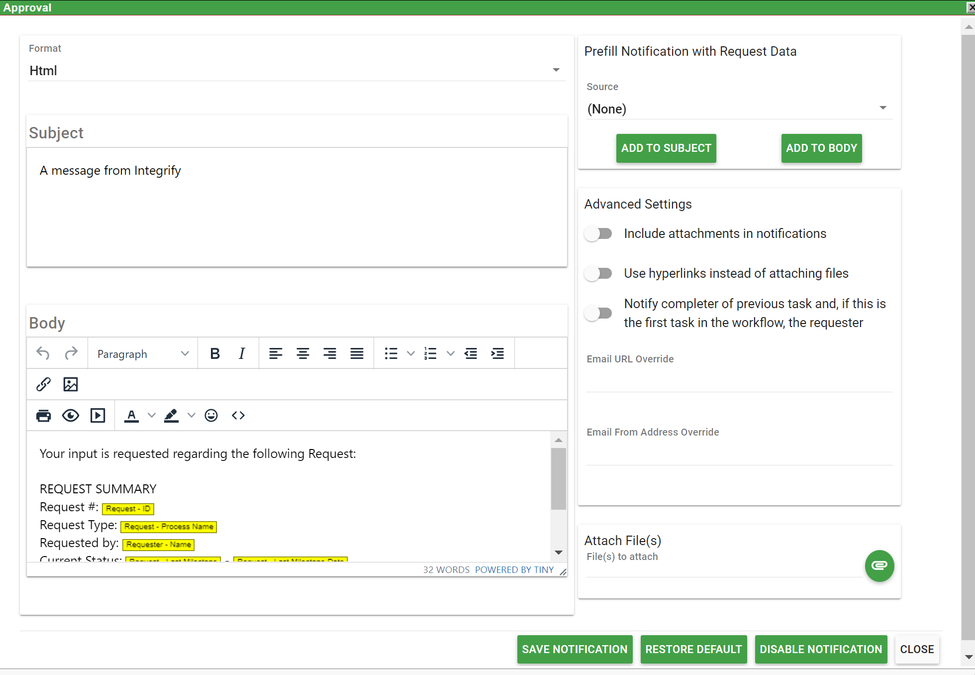 After the “Request #:” text you see highlighted text with the Request ID inside of it. What this indicates to Integrify is that when that email is sent, Integrify will add the unique Request ID that is generated for the request that is currently executed.