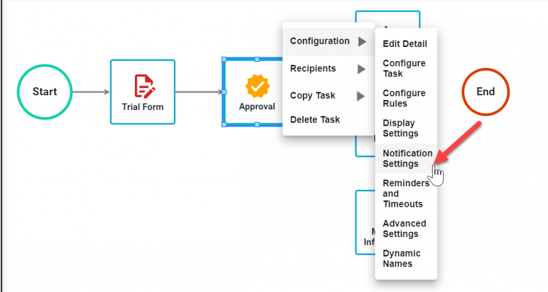 To alter the subject, body, or format of the emails being sent to a user when a task is assigned or when a reminder is sent, right-click on the task, hover over Configuration, and click Notification Settings.
