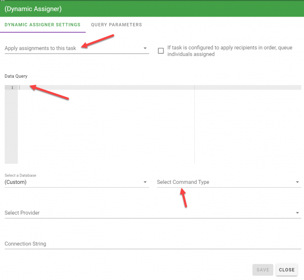 The Dynamic Assigner task allows the use of SQL and collected form data (or other request-specific information) to define task recipients.