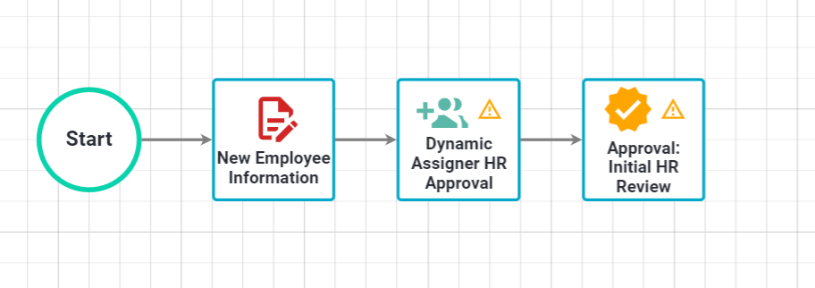 Our training example is a New Employee Onboarding Process. In this process, the employee will fill in an initial New Employee Information form. After the completion of this form, the Dynamic Assigner plugin will execute and use data provided by the New Employee to assign the appropriate HR representative for initial approval.
