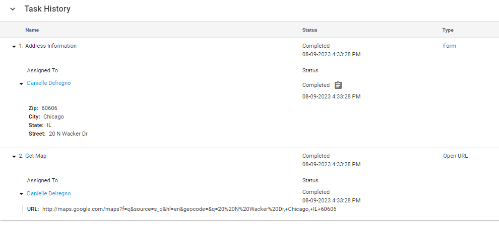 In this example, when the user submits their Address Information Form and enters 20 N Wacker Dr, Chicago, IL 60606, the process will automatically open the following window for them:
