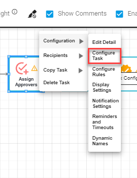 To configure the Task Assigner, hover over it and select Configure Task: