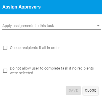| Queue recipients if all in order | Slide Button | No | If you plan to assign multiple recipients and have them complete the task in a specific order turn this on. When selecting recipients in the next step, make sure to select “Each in Order” at the top of the Recipients dialog box. You’ll then select the recipients in the order they should be assigned. |