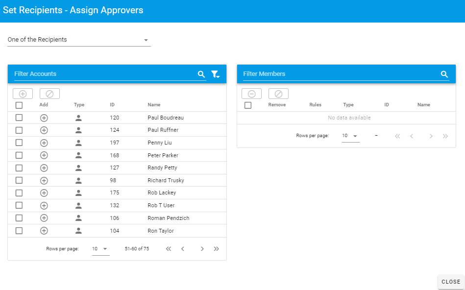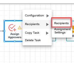 Hover over the Task Assigner and select “Recipients.” You can then choose the users who will be assigned the subsequent task. In this case, we’ve selected two recipients (Bob User and Bruce Smith) and configured them to complete the task in the order we’ve selected them.