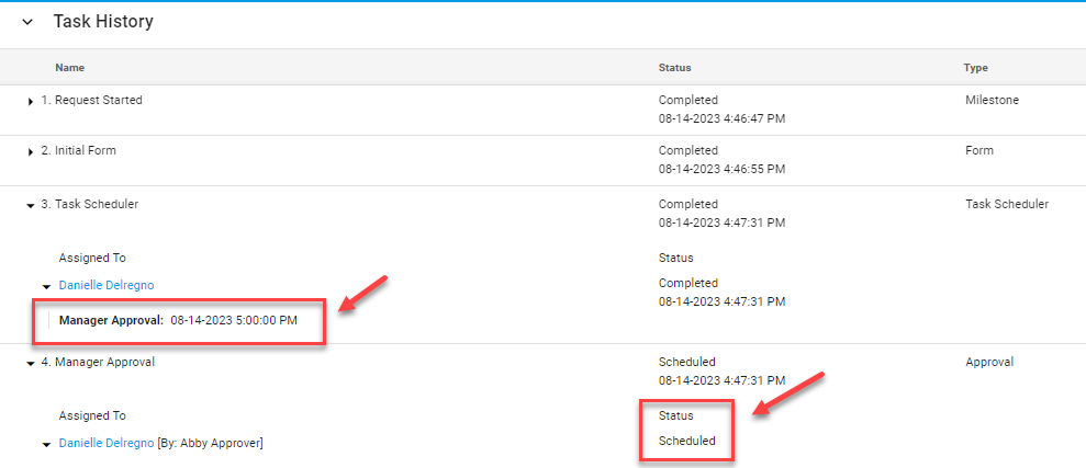 Note: By coupling the Task Scheduler with a Launch Request task type, users can schedule a new request (instance of a process) to start. You can also use the Form Assigner task type to allow users to schedule the start dates of future tasks. The only difference being is that this Task Scheduler allows the user to also choose the hour and time zone that the future task will start.