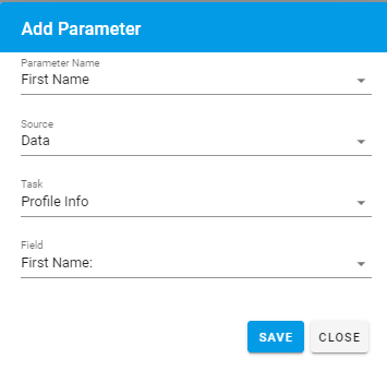 Now you can select a contact table field from ’Profile Attribute ’ that will be updated and then the source information. In this case, under Source, we are selecting the Data from the Profile Info Form task, and selecting the First Name Field. Select ’Save ’ to add the attribute parameter.