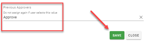 Enter a value in the Previous Approvers field labeled “Do not assign again if the user selects this value” that corresponds to an approval choice you have already created. If a user chooses this value the first time the approval is assigned, and the approval task is reassigned, that user will not be requested to complete the approval again. Other approvers may be reassigned if they did not choose the configured value.