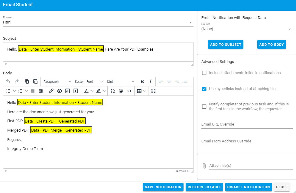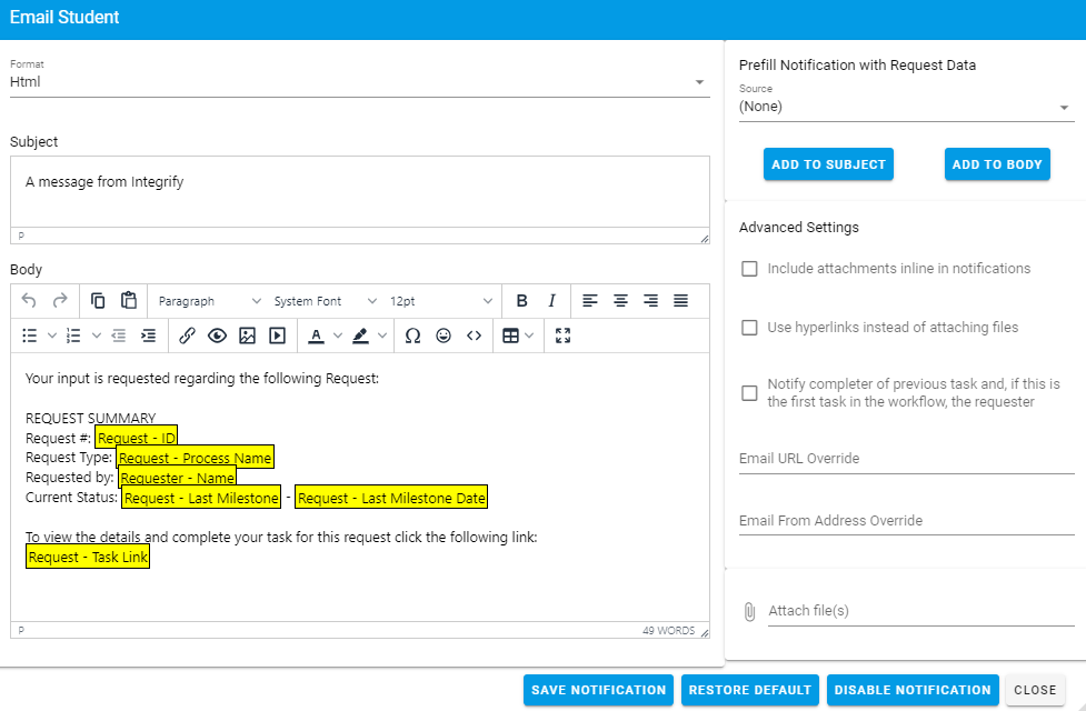 You can configure the Subject line and Body of the email however you’d like. For more information on configuring notifications click the following pages: Dynamic Notifications and General Notifications.