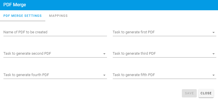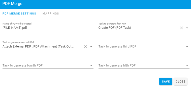 - Task to generate first PDF: You will have the option to select any of the tasks and fields within your process as the sources of the merged PDF. You should order the mapping in the order in which you want the documents to be displayed in the final file.