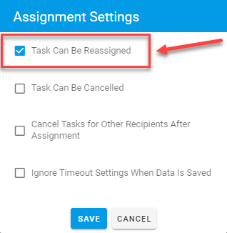 If selected, any user assigned to this task will have an option made available for him/her to search and assign the task to another user in Integrify.