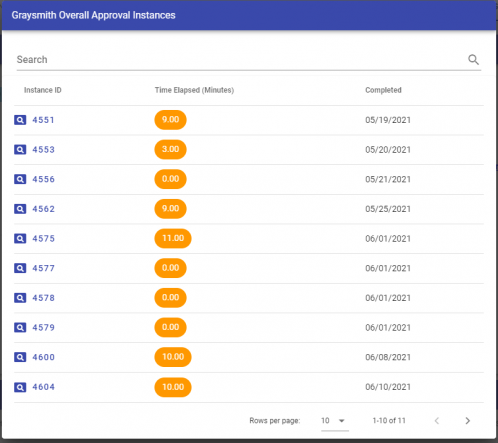 also displays that will open a dialog box with a list of all the Requests that are included in the KPI timespan. The KPI status (Yellow, Green, Red) is shown for each Request, and you’re able to click the View icon to open any of the Requests in the list.