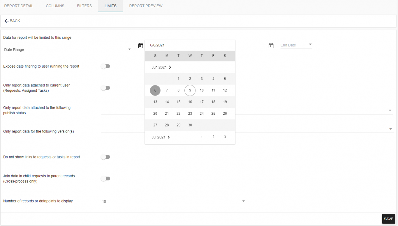 At a minimum when using the Date Range option, you will need to add a date in the Start Range option. In the example above, the report will never retrieve request data for requests that were started prior to June 6, 2021. Even if the report date filters are exposed to the end-user, they will still be restricted to any requests that start after June 6, 2021.
