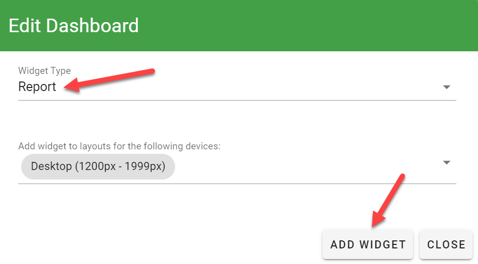 After clicking Add Widget, choose which report you’d like to appear on the dashboard.
