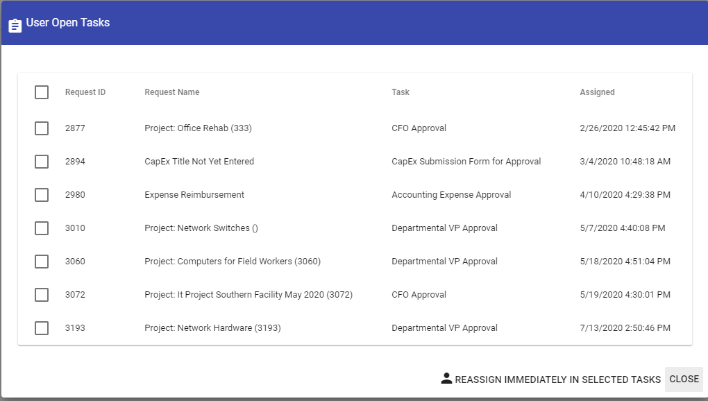 If you need to quickly replace a user who has several open tasks, you can do that right from the Open Tasks window. Simply click on any open tasks that you’d like to replace with your selected replacement user and click “Reassign Immediately in Selected Tasks”.