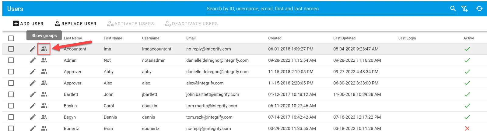 You can also view which groups that a user has been assigned to by clicking the "Show Groups"**** icon in the row of the user:\