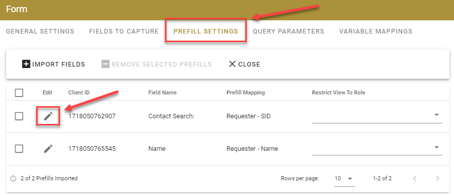 Next, select the Prefill Settings tab, find the contact search you are wishing to prefill, and select the pencil icon.