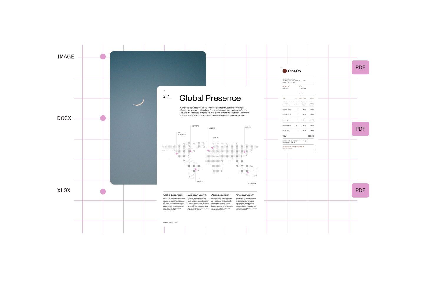 Convert Word, Excel, TIFF, JPEG, PNG, and other file types into high-fidelity PDFs. Handle large volumes with batch automation, and generate either optimized visuals or searchable content.
