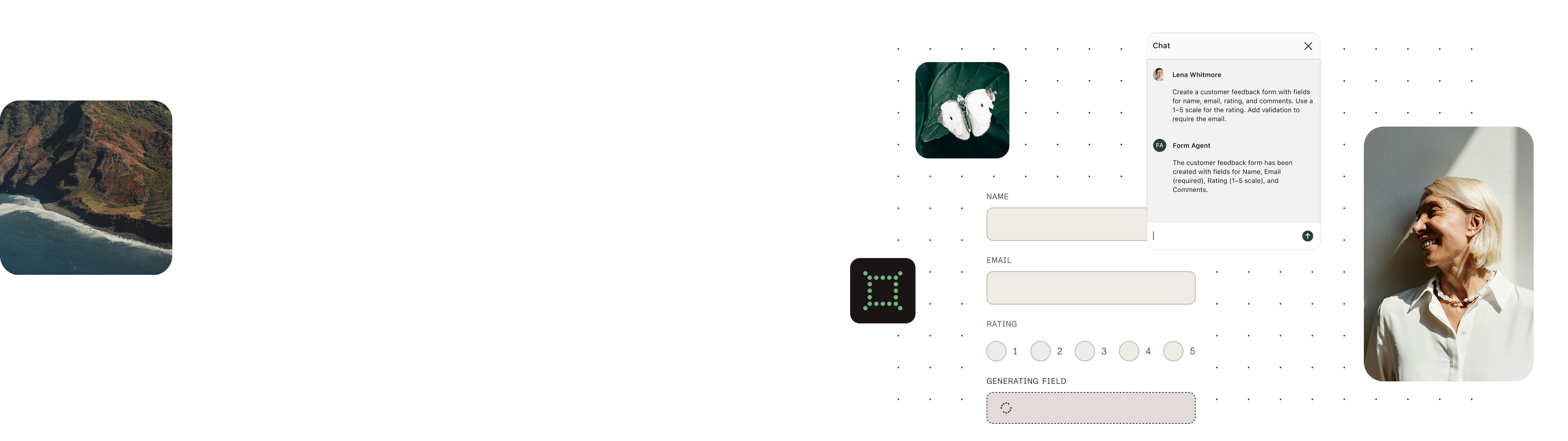 Users describe the form they need using plain language or upload a file (like a PDF, spreadsheet, or JSON). The agent then builds a complete form using intelligent defaults — including required fields, field types, naming conventions, and layout. Users can refine the form in real time through a guided chat interface.